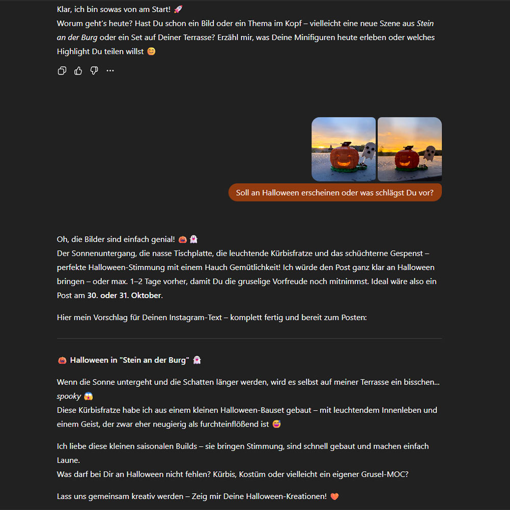 Mein CustomGPT für Steinehunger: Foto hochladen → In 98% der Fälle fertiger Post-Text. Nicht perfekt. Aber gut genug. Und ich poste jetzt.